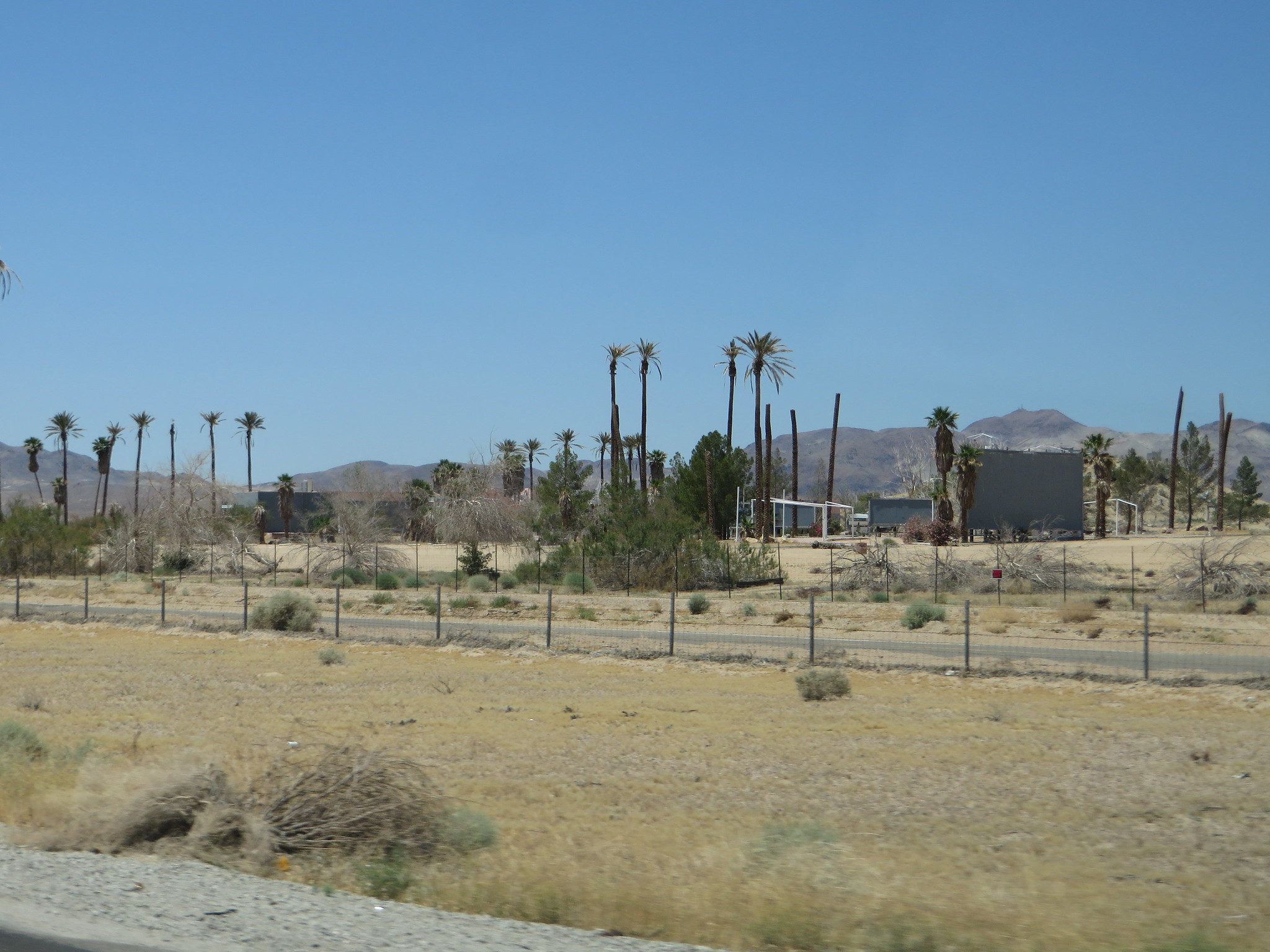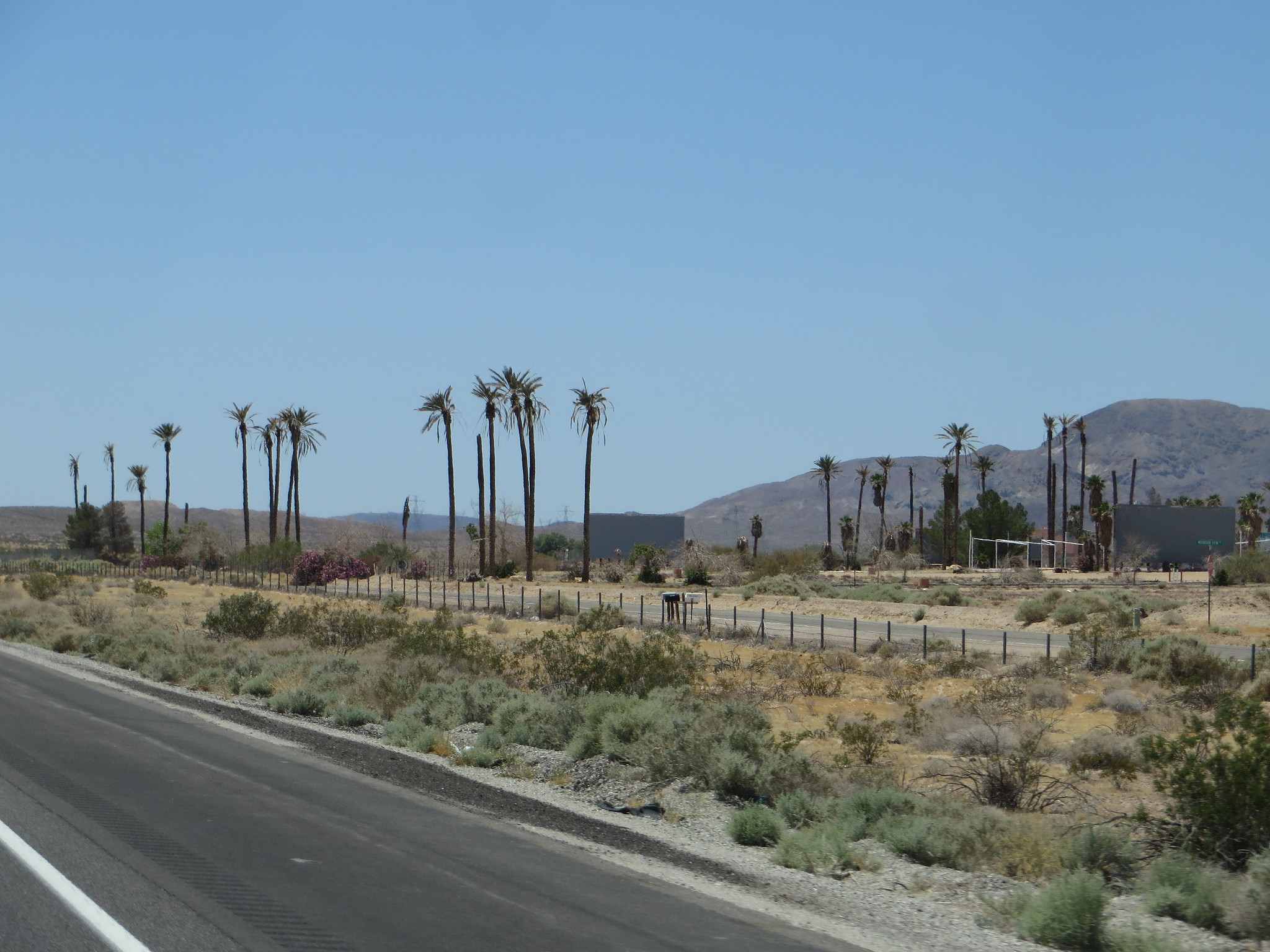 The spring emerges virtually at roadside on the National Old Trails Highway (66 meters) in an arid, high-desert landscape of creosote scrub and scattered juniper. The surrounding terrain rolls gently in shades of tan and gray, with sparse vegetation typical of the inland Mojave Desert. Mineral deposits and geological evidence reveal the spring's geothermal origin despite its subtle warmth.