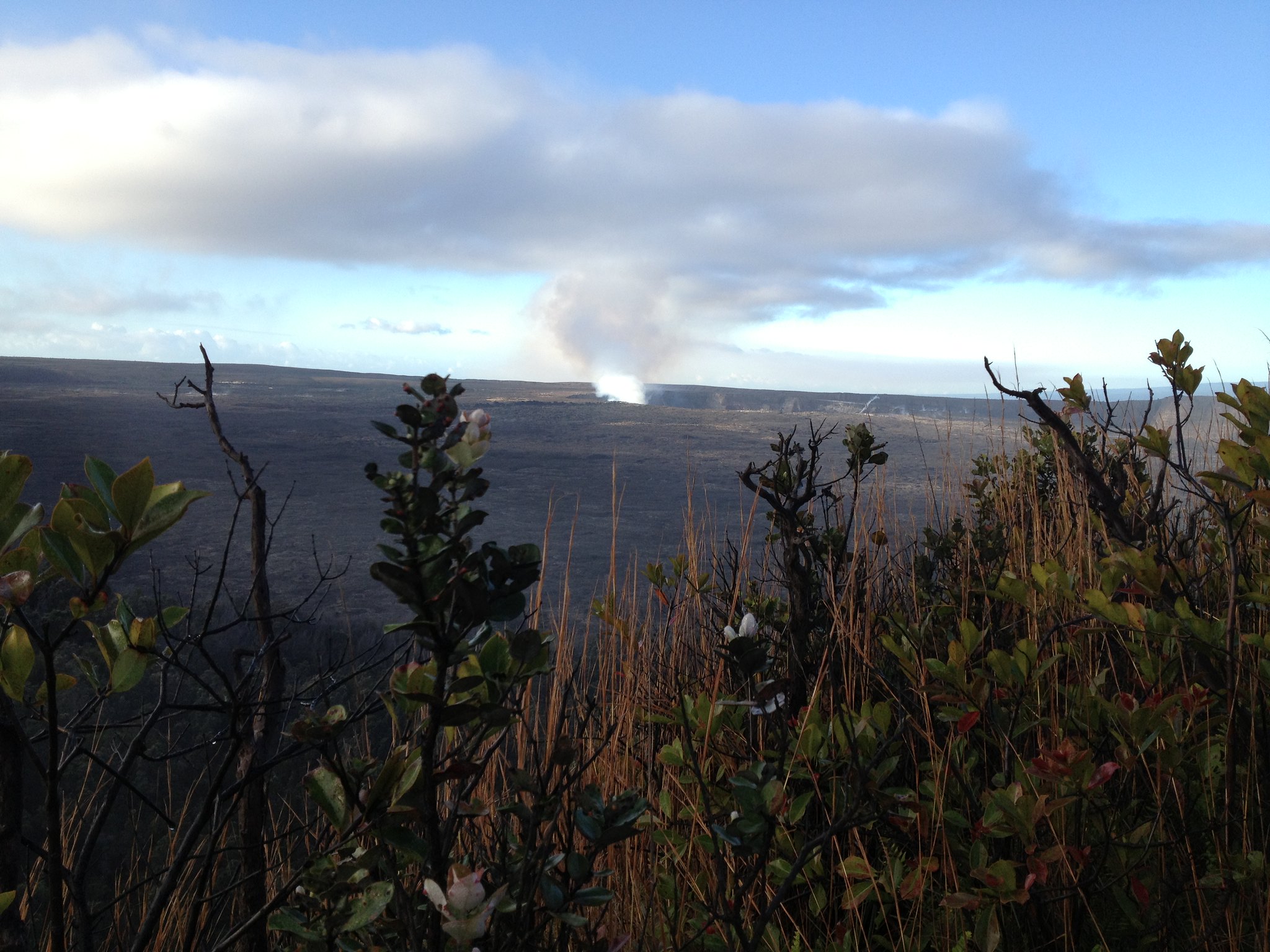 Hikers approach through Hawai'i Volcanoes National Park's interior, ascending into increasingly alpine terrain where vegetation thins dramatically. At this elevation, temperatures average 63.7°F despite the tropical latitude, and steam vents hiss through rocky ground.