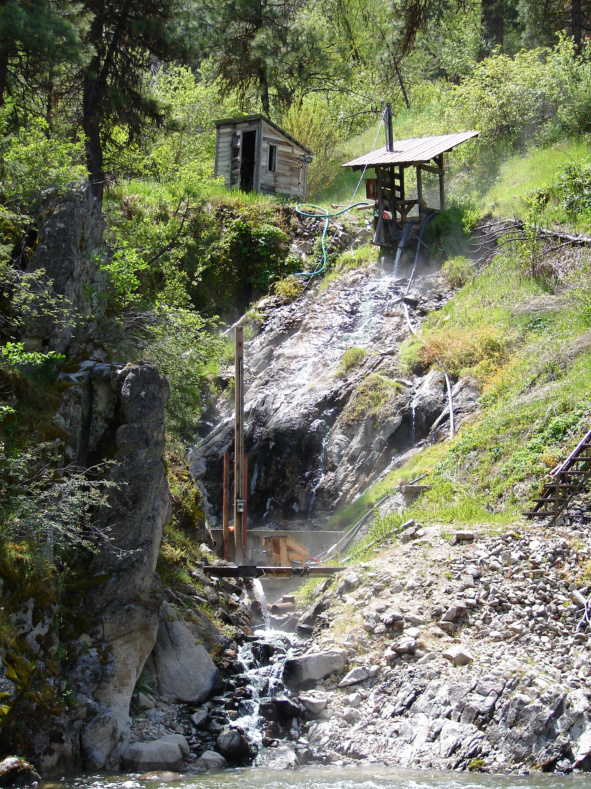 The Banks-Lowman corridor follows a geothermal fairway along the South Fork Payette River where multiple hot springs surface through fractured granitic rock. This spring's highly alkaline pH of 9.0 and sodium-dominated chemistry, with 77 mg/L sodium and negligible magnesium at 0.1 mg/L, indicates deep-source water rising along canyon-bottom faults. USGS measurements showed 42°C with a small discharge of 0.01 cubic feet per second. The highway has connected Boise to the Stanley Basin since the early twentieth century.