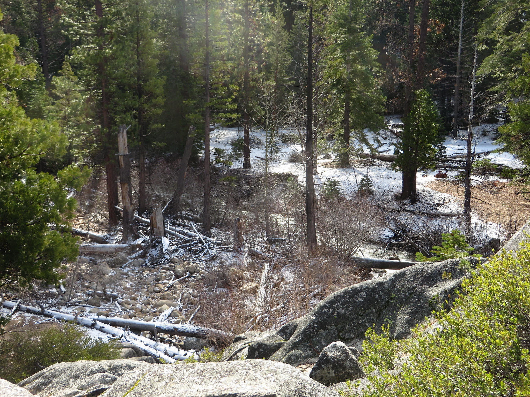 The spring emerges on the eastern flank of the Sierra Nevada at nearly 6,000 feet elevation, where coniferous forest and montane meadows define the landscape. The site receives 29.7 inches of annual precipitation and over 156 inches of snow, supporting dense tree cover and riparian vegetation. The park is located 143.5 meters from the nearest road, with developed facilities including campgrounds and trail networks providing access to the surrounding wilderness.