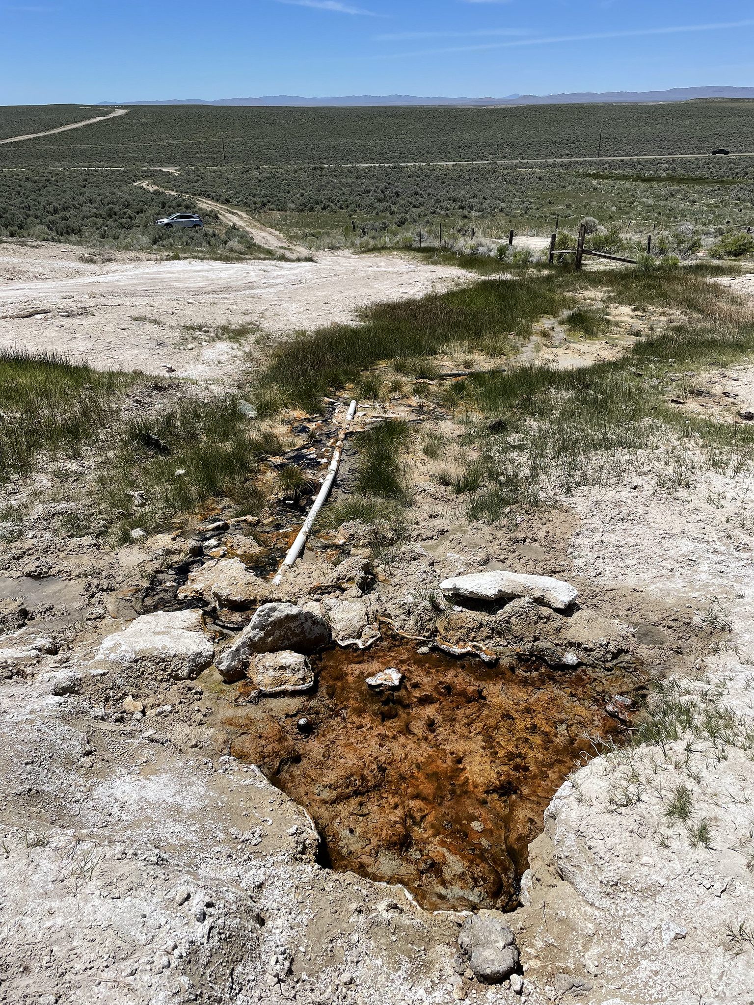 This thermal spring near Wells flows at 142°F on BLM's Wells Field Office land, delivering water 94.8 degrees above the 47.2°F ambient temperature. Recent USGS analysis recorded 55°C water with mildly acidic pH 6.6 and remarkably high sodium (370 mg/L)—more than seven times typical values—alongside moderate calcium (48 mg/L) and low sulfate (12 mg/L). Located 224.5 meters from Upper Metropolis Road, it requires a short walk to reach.