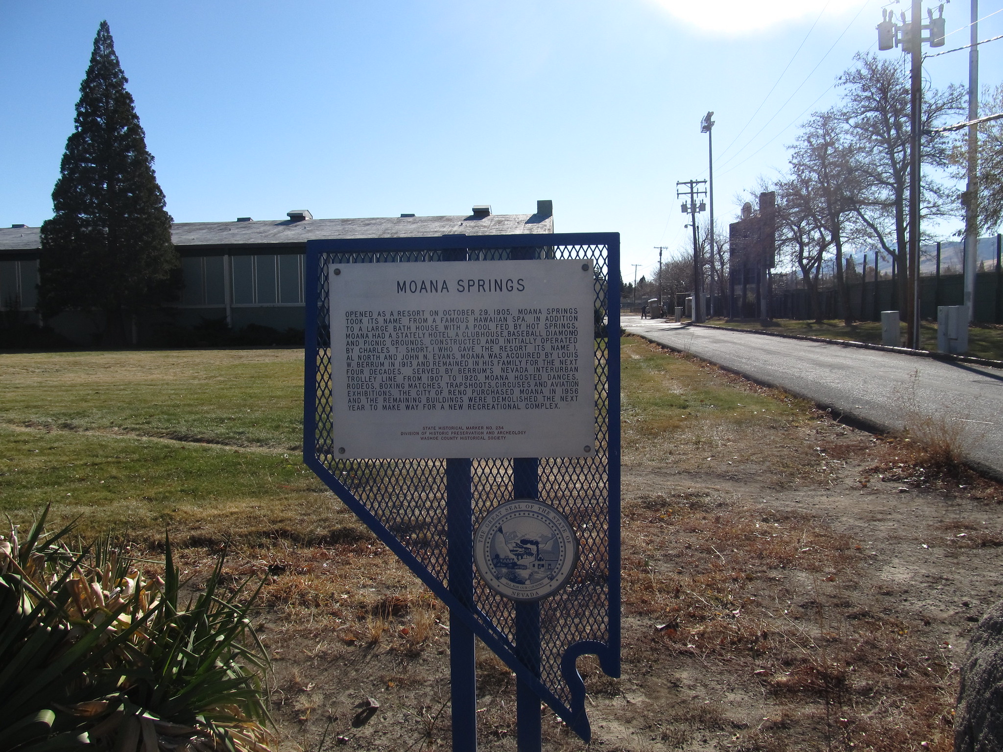Moana Springs takes its name from the surrounding Moana neighborhood in southwest Reno, developed in the early 20th century. The thermal waters have been tapped for geothermal heating since Reno's early growth, with the area's numerous hot springs influencing residential and commercial development patterns. The spring remains active within the urban fabric, representing the city's extensive geothermal resource that has been utilized for swimming pools, bathhouses, and building heat over decades.