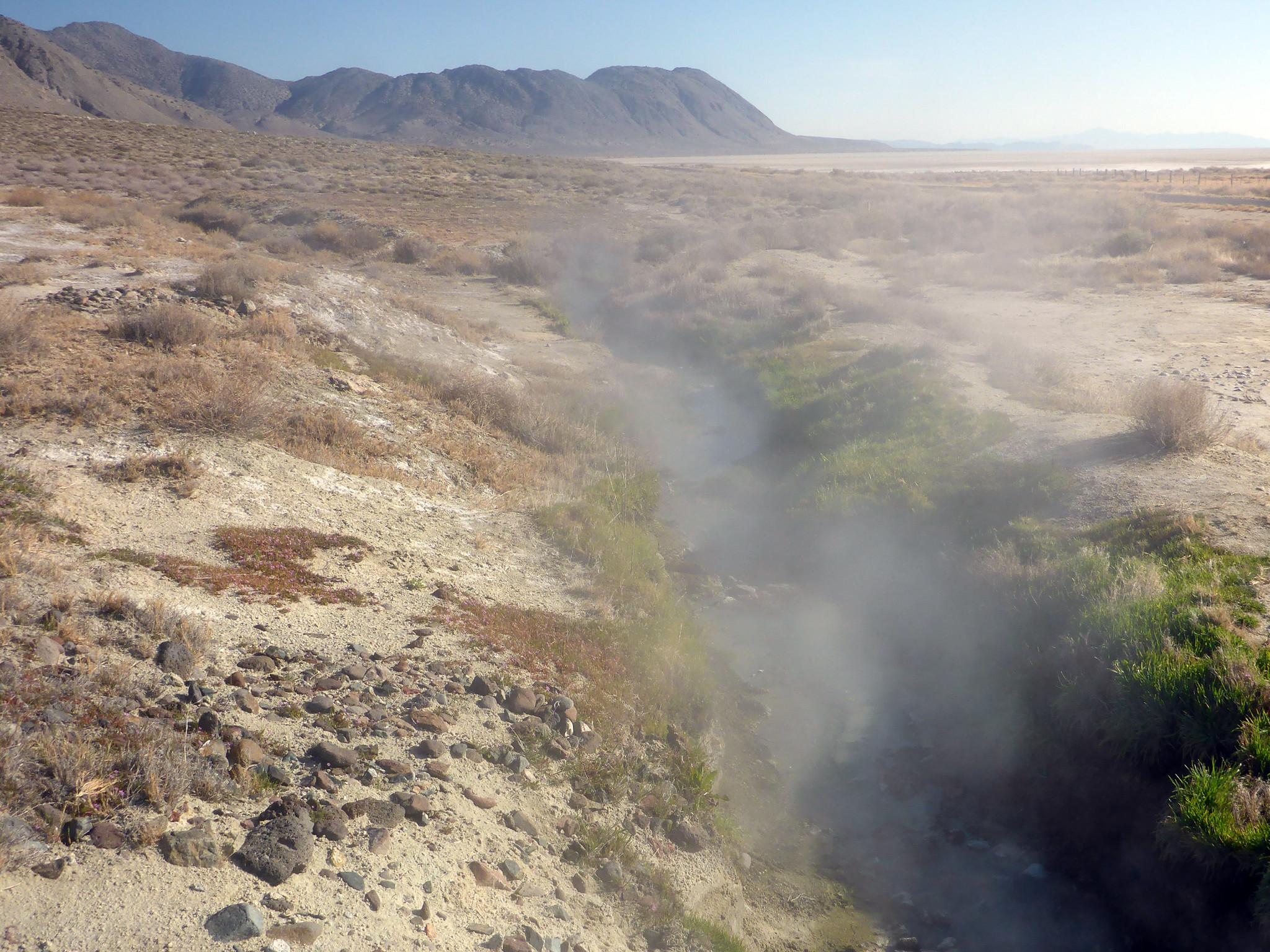 Flowing at 194°F just 9.5 meters from Old State Route 34, this unnamed Pershing County spring registers 138.8 degrees above ambient air temperature with USGS-documented chemistry showing 2,000 mg/L chloride and 1,400 mg/L sodium in mildly alkaline water at pH 8.1.