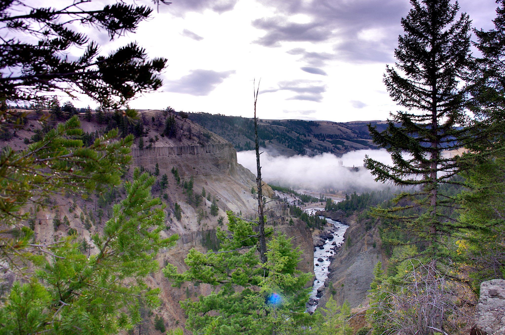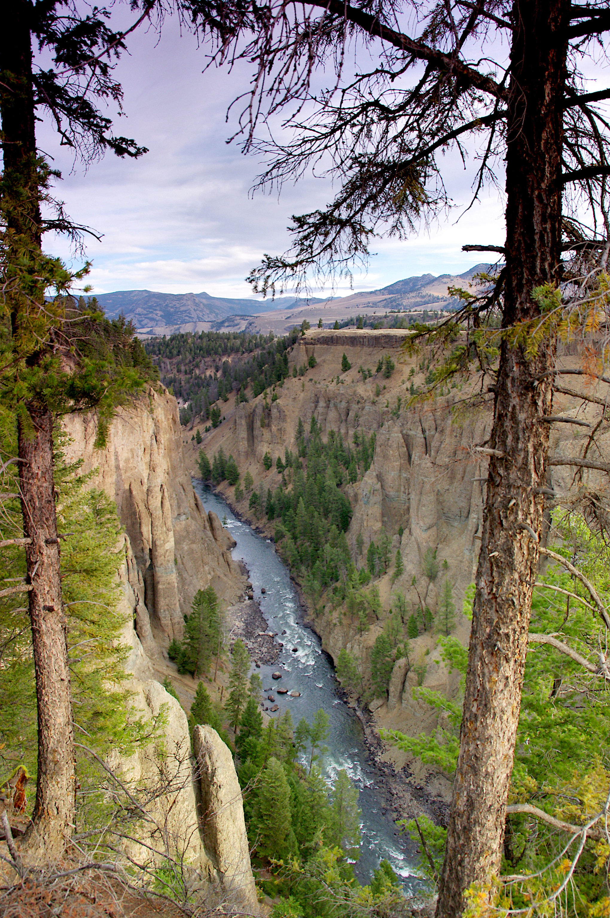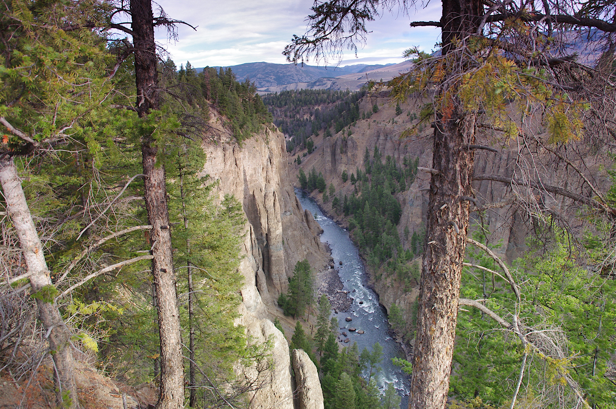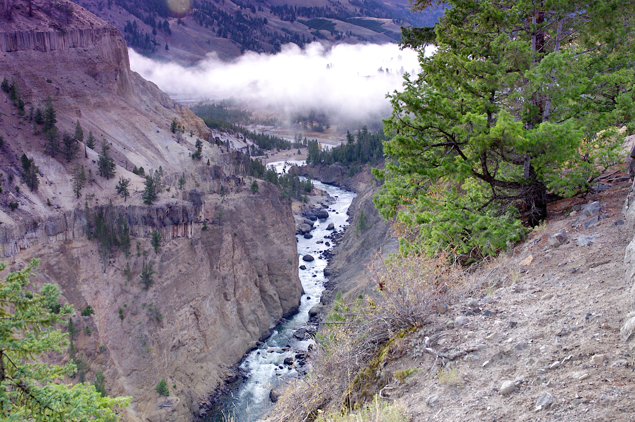 The springs flow from steep canyon walls carved by the Yellowstone River, where thermal vents stain the rock face with mineral deposits that inspired the feature's name. At this elevation, the terrain receives 26.5 inches of precipitation and 127 inches of snow annually. The surrounding landscape transitions between lodgepole pine forest and open thermal zones, with the Lamar Valley's wildlife-rich grasslands extending to the northeast.