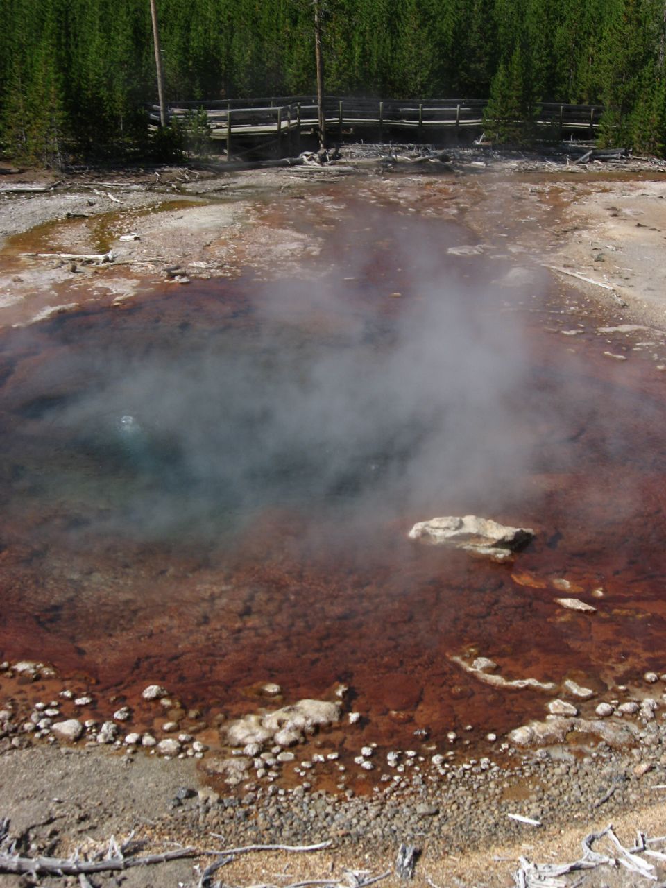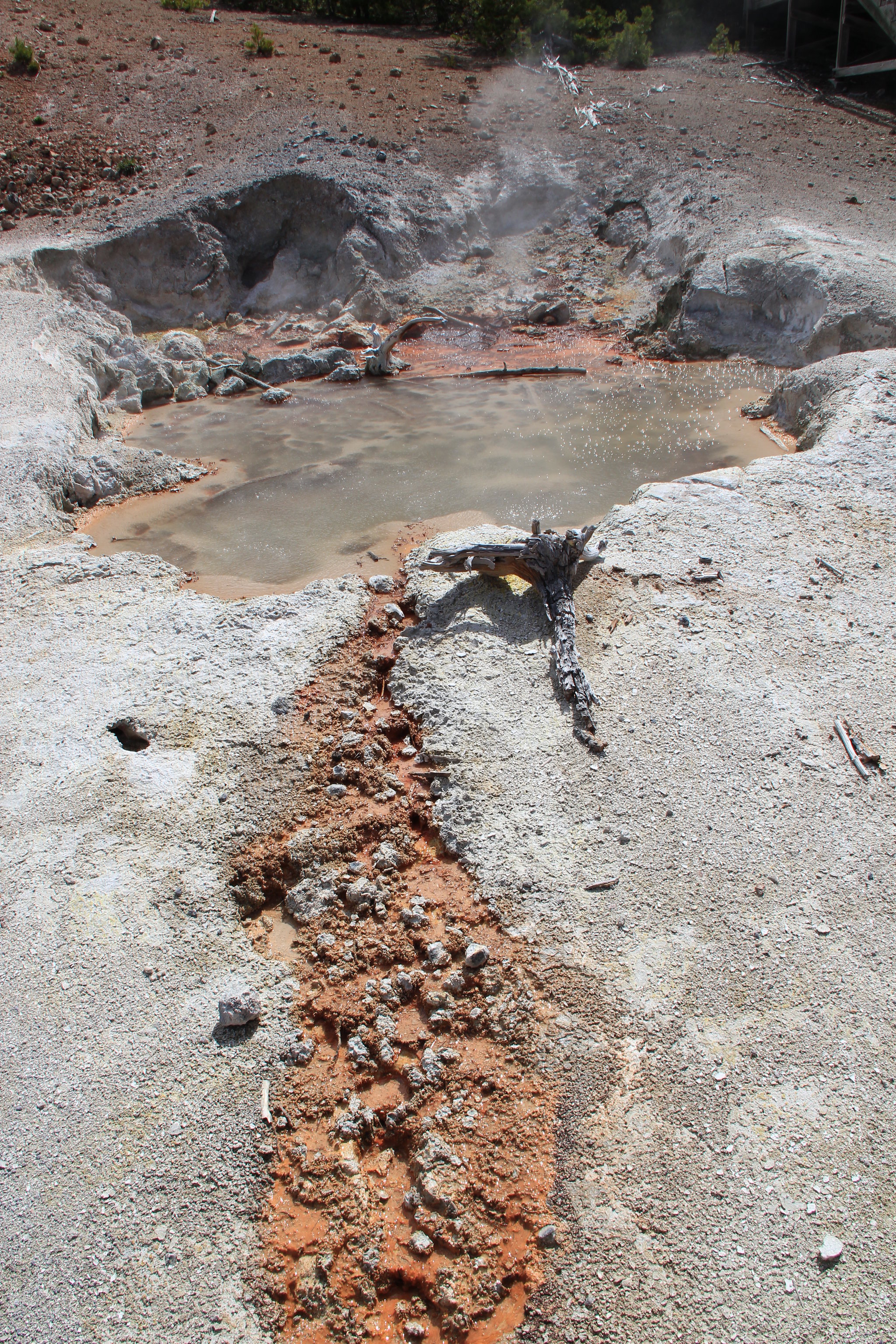 The geyser occupies the Porcelain Basin section of Norris, where acidic waters and intense thermal activity have created extensive sinter deposits and bleached, thermally altered soils. At 7,510 feet elevation, the area receives 27 inches of precipitation and 137 inches of snow annually. The surrounding landscape shows the characteristic barren, whitish terrain of acid-sulfate thermal areas, with fumaroles and steam vents creating constant atmospheric haze across the basin.