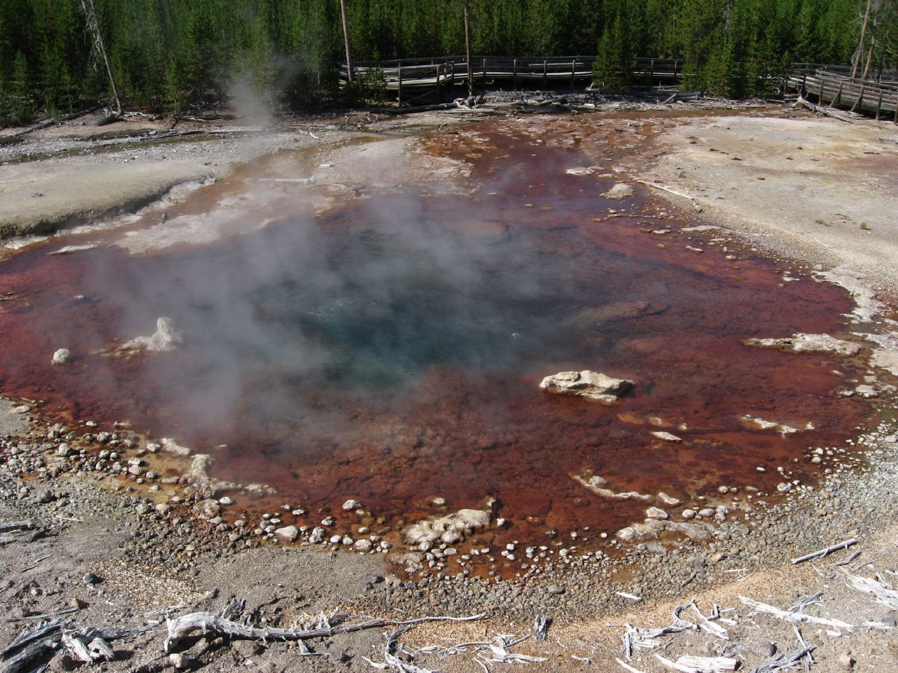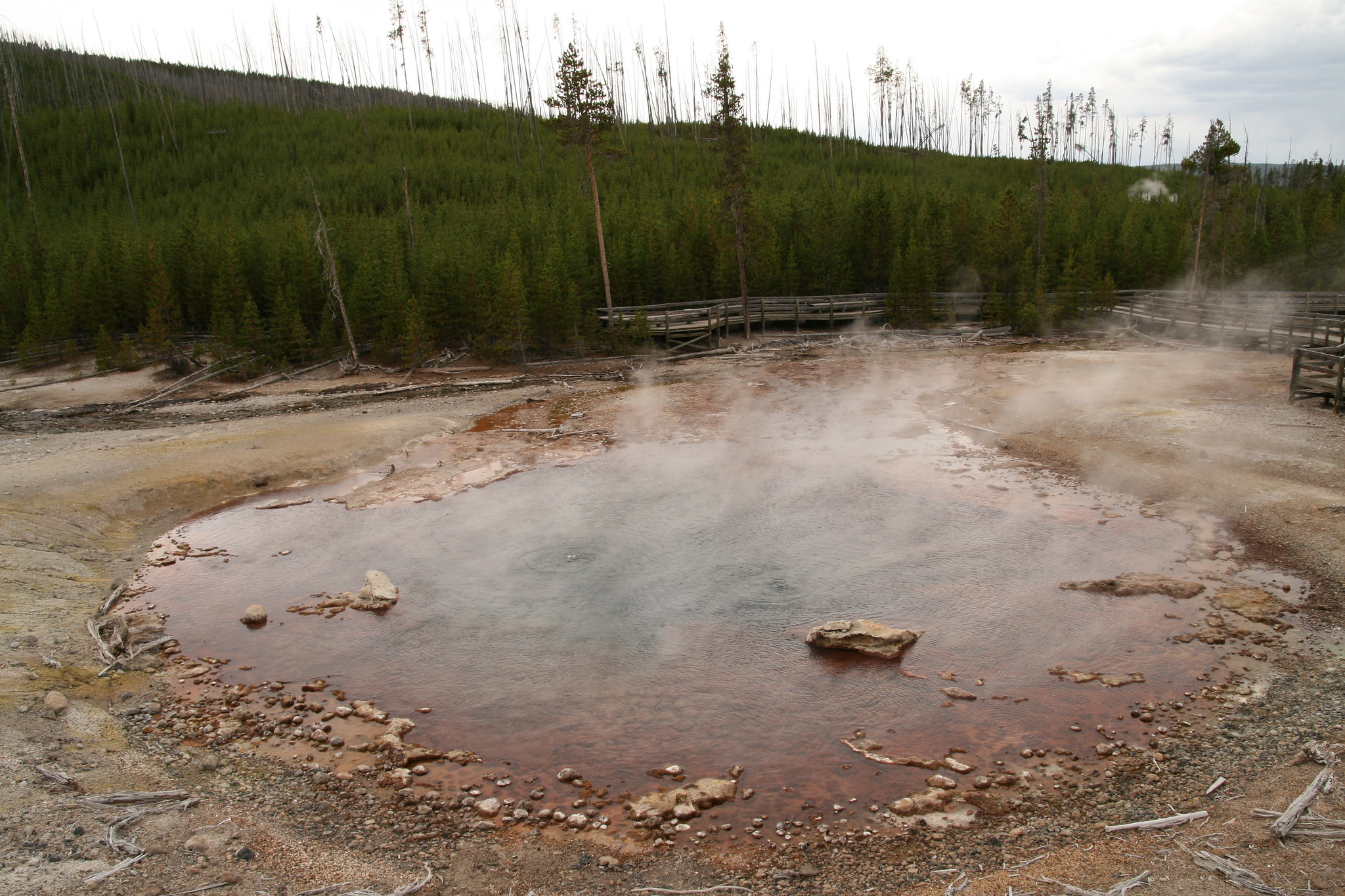 Echinus takes its name from the spiny, sea-urchin-like mineral formations that once characterized its crater and surrounding deposits. The geyser has undergone periods of active eruption alternating with quieter hot spring behavior throughout recorded history, with eruption patterns shifting substantially over recent decades. Norris Basin's thermal features have been systematically documented since the 1870s, making Echinus one of the park's well-studied geysers.