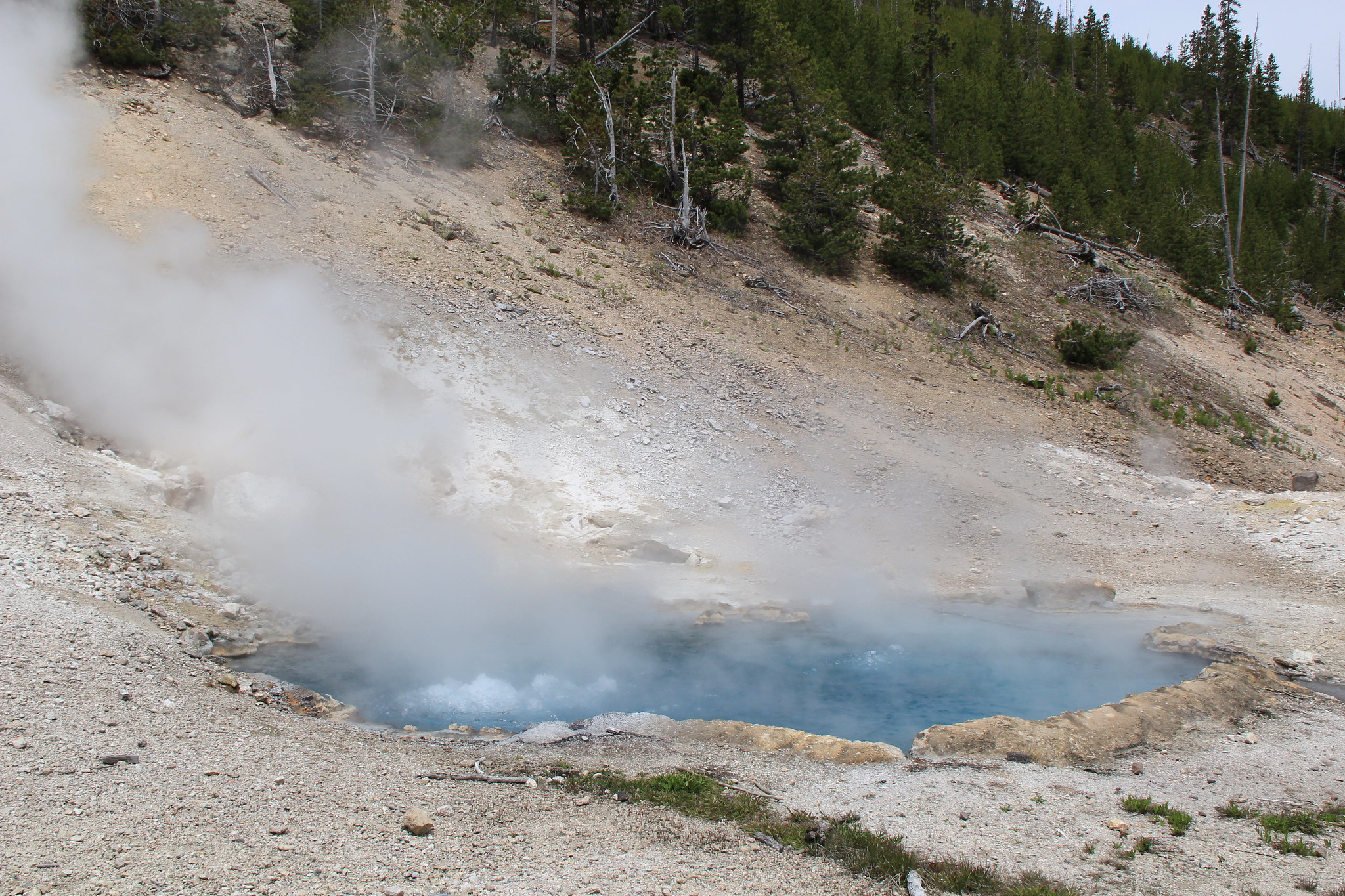 The basin occupies a steep thermal hillside above the Gibbon River where annual snowfall reaches 123 inches and precipitation totals nearly 26 inches. Cone-shaped sinter deposits give the area its name, with weathered thermal features scattered across the slope in lodgepole pine forest.
